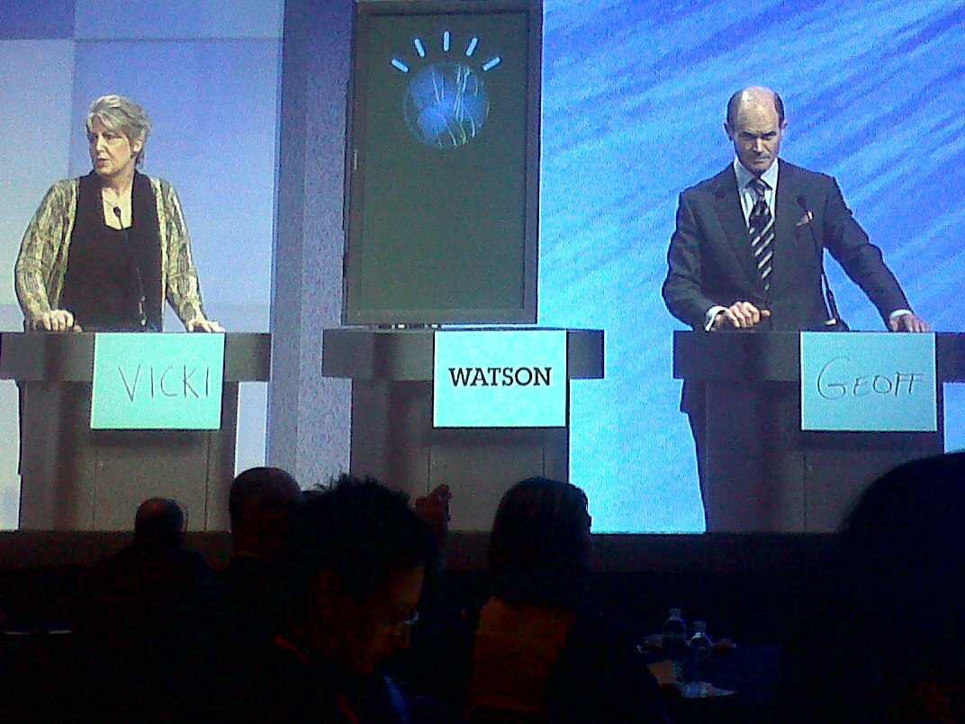 Na sequência, foi nos apresentado o Watson, um supercomputador da IBM, que ganhou US$ 1 milhão no Jeopardy!, o jogo de perguntas e respostas mais popular da TV americana. Watson é um tipo de “equipamento para responder perguntas” que durante décadas deu muito trabalho aos pesquisadores da inteligência artificial – algo similar ao computador da série Jornada nas Estrelas, que entende questões construídas em linguagem natural e que oferece respostas. No “projeto Jeopardy!”, os pesquisadores da IBM tiveram de enfrentar um jogo que não somente requer um conhecimento enciclopédico como também exige habilidades para decifrar frases complicadas e, muitas vezes, obscuras – no jogo, o apresentador oferece uma resposta e o competidor precisa fazer a pergunta correta – além de uma dose de sorte, rapidez e estratégia na hora de apertar um botão. Nesta sessão na NRF foi apresentada uma simulação deste jogo, onde participaram Vicky e Geoffrey Colvin da Fortune, e, obviamente, foram derrotados por Watson.
