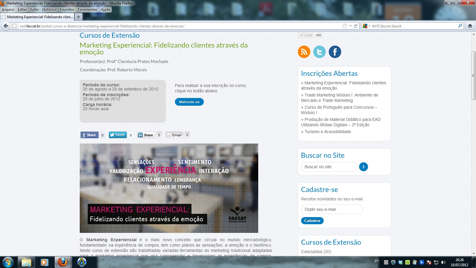 O Marketing Experiencial é o mais novo conceito que circula entre os mercados mundiais, fundamentado na experiência de compra, tem como pilares as sensações, a emoção e o hedônico. Para discutir este tema, a FACCAT realizará um curso de extensão em formato EAD, onde eu estarei trabalhando variadas ferramentas do marketing tradicional adaptadas para o marketing experiencial visando compreender e desenvolver as experiências de compra, experiências de marca e a abordagem sensorial e afetiva do consumo.